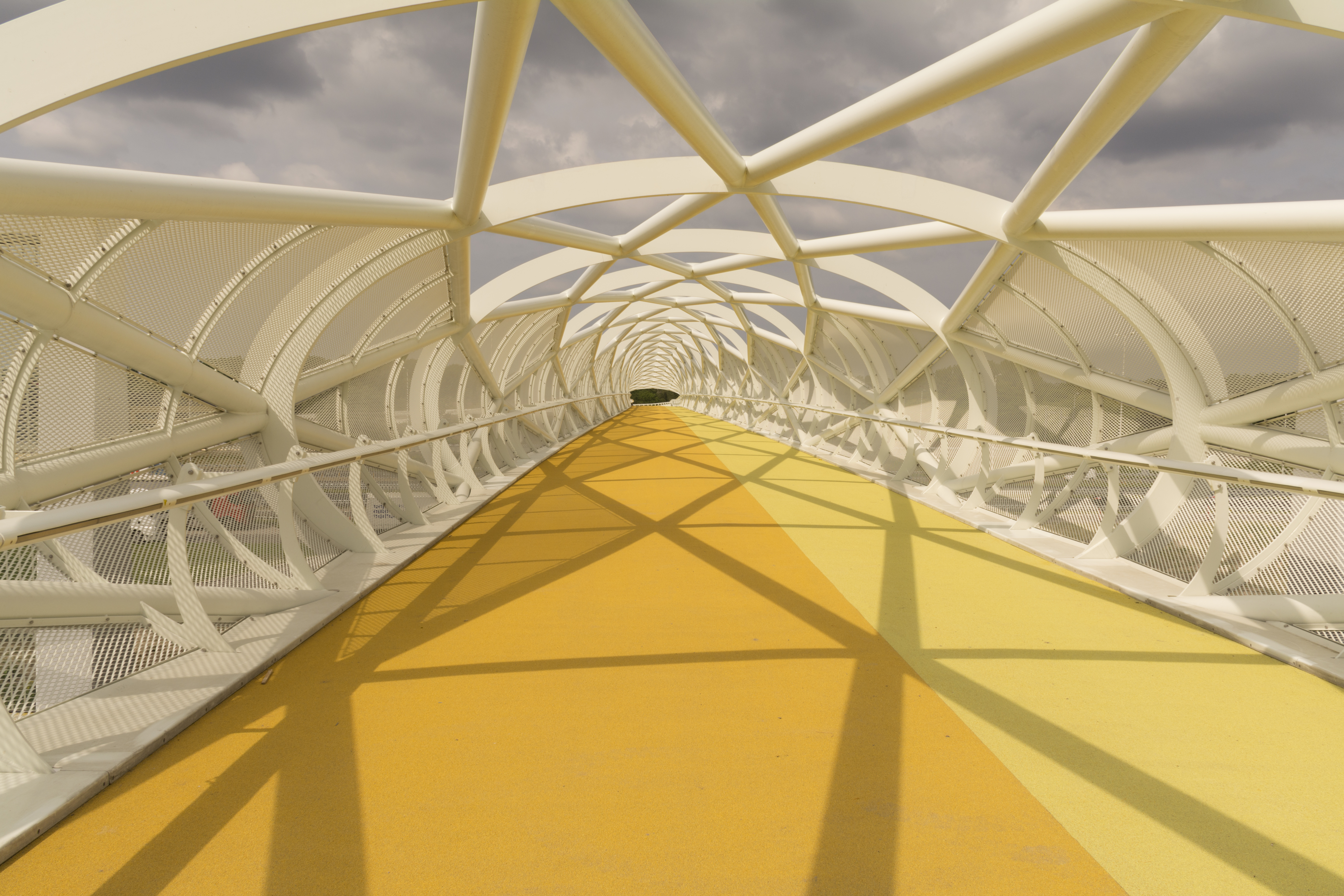 The nickname of this bridge over the highway A15 near Rotterdam for cyclists and pedestrians is "De netkous" (fishnet stocking). The official name is "Groene verbinding" (Green connection) designed by Marc Verheijen.